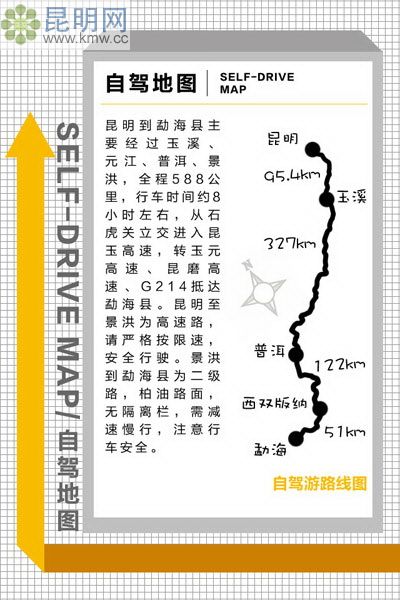 昆明到勐海縣主要經過玉溪、元江、普洱、景洪,全程588公里,行車時間約8小時左右,從石虎關立交進入昆玉高速,轉玉元高速、昆磨高速、G214抵達勐海縣。昆明至景洪為高速路,請嚴格按限速,安全行駛。景洪到勐海縣為二級路,柏油路面,無隔離欄,需減速慢行,注意行車安全。